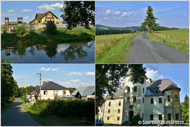 Cyklostezka vede podél zámku. S jistým odstupem asi půl druhého kilometru kopíruje hlavní silnici bočními uličkami, ale nakonec se stejně napojí. Komu se po hlavní cestě jet nechce, pokračuje po značené cyklostezce na Starou Ves a Žďárský Potok. Stará Ves je na první pohled větší než to, co člověk zahlédne ze silnice na Skřítek. Je to tady takové různorodé. Staré chátrající domy i krásně udržované chalupy. Kousek bokem, doprava přes potok, stojí pěkný kostel. Cesta vede už zase mírně vzhůru, ale ne neušlapatelně. Po čase míjím pilu, rozcestí U pily a pak následuje bývalá huť. Huť tam už samozřejmě není, ale zajímavou památkou na ni jsou pozůstatky zdí a budov, vodní náhon a věžička s hodinami na svahu nad silnicí. Pár metrů dál najdeme restauraci Anenská huť. Totéž co jsem napsal o Staré Vsi lze napsat i o Žďárském Potoku. Jedete-li silnicí I.třídy, moc z něj neuvidíte. Z cyklostezky je pohled zcela jiný. Řadovky na začátku mnoho neřeknou, to je fakt, ale jen kousek dál už najdeme mnohem líbivější chalupy a roubenky. Hodně jich slouží jako penziony, je tu i jeden docela velký hotel. Bydlím (když se to vezme kolem a kolem) nedaleko odtud, od nás ze Šumperka do Rýmařova jsem projel autem nebo autobusem mockrát, ale o téhle tváři Žďárského Potoka jsem neměl potuchy. Nahoru na Skřítek jsem měl původně v plánu vyjet cyklostezkou kolem Škaredé jedle a lovecké chaty Hubert, ale odradila mě varovná cedule. Prý je tam 400 metrů nesjízdného úseku a trasa vhodná jen pro zdatné cyklisty. Nejsem úplný zelenáč, ale se svým kolem se mi nechce nějaké neprůjezdné úseky riskovat. Jednou, třeba až si pořídím horské kolo, to projedu opačným směrem. Teď raději dávám na varování a beru to oklikou na hlavní silnici. Není to sice úplně to pravé, jezdí tam dost aut a motorkáři si to tam často pletou se závodním okruhem, ale je to také prověřený směr a já po všech ujetých kilometrech a zdolaných kopcích nemám chuť pouštět se do dalších náročnějších akcí. V klidu vyšlapu nahoru na Skřítek a potom uvidím jak dál.