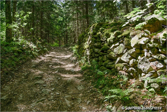 Terén nyní bude až do konce pouze klesat a lišit se jen v tom jak prudce padá dolů. Začátek pohoda. pěšina borůvčím, sem tam nějaký šutr nebo kořen. Poté nízký porost vystřídá normálně rostlý les, kde potěší několik pěkných scenérií viděných buď pasekami nebo prostě mezi stromy před sebou. Na chvíli se jde i trošku otevřenějším místem, po levici tam stojí menší skalka, ale hned na to se zase prochází hustým lesem, který dávno ztratil svůj divoký horský charakter.